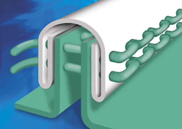 Náš vazný šev je rafinovaná verze standardního švu. Je to více nepropustný, protože lem je jako kapuce. Je silnější, protože každá dvojitá řada prošitých prochází šesti vrstvami látky. Je to bezpečnější, protože uhlíková vlákna tkaná v celém lemu jsou lépe vodivá, a to i po opakovaném praní.
