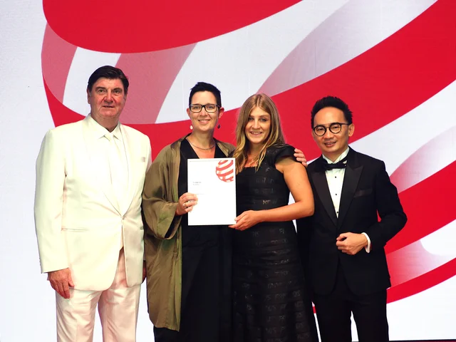 Lene Jul und Matilda Simon nehmen den Red Dot Award bei der Preisverleihung in Singapur entgegen.