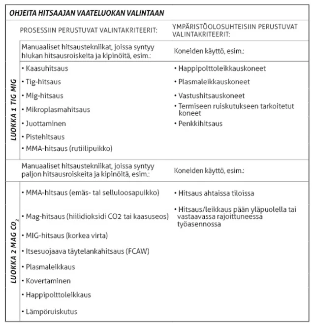 Alla oleva taulukko ohjeistaa kumpaan luokkaan (luokka 1, luokka 2) kuuluvia hitsausvaatteita tarvitset työssäsi. Materiaalin tulee kestää vähintään 15 tippaa sulaa metallia ylittämättä 40°C lämpötilaa ja aiheuttamatta palovammoja iholle.