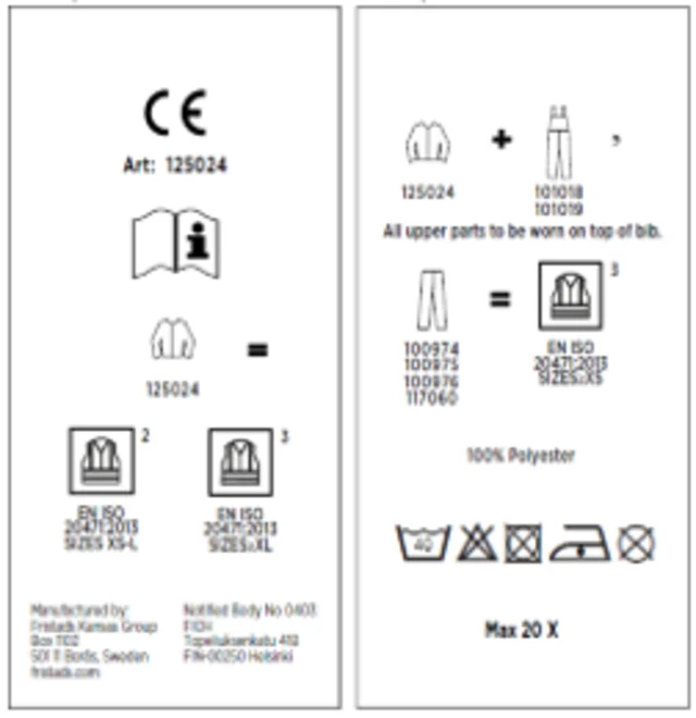 Tuote on CE-merkitty ja siinä tulee olla Fristadsin osoitetiedot. Nämä tiedot löytyvät vaatteen pesulapusta.