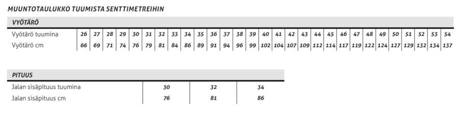 Mittaa vyötärösi. Oikean housukoon löytämiseksi voidaan lähteä liikkeelle esimerkiksi farkkujen tuumakoosta. Tuumakoko kertoo vyötärön mitan. Alta löydät muuntotaulukon tuumista senttimetreihin.