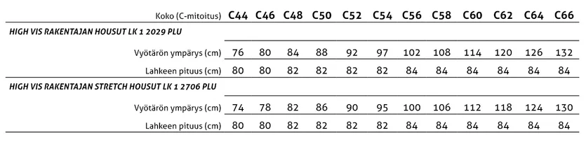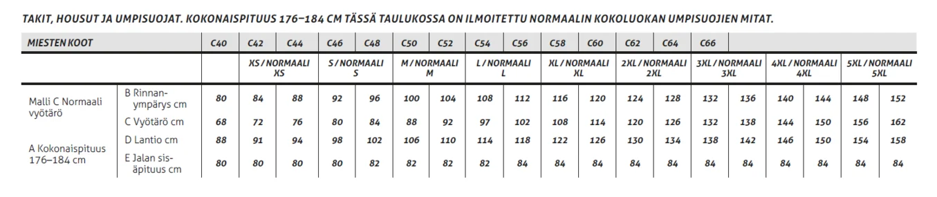pitkä lahkeenpituus – C-mitat (C144-C168)