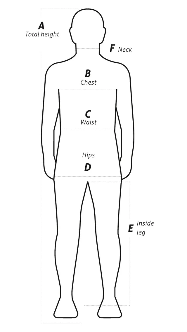 Pour l’achat de pantalons, mesure A C, D, E et, pour les vestes, mesure B (tailles XS-5XL). Mesure A, B, D, E pour les combinaisons et, en fonction de votre taille, choisissez la taille normale, longue ou petite dans les tableaux.