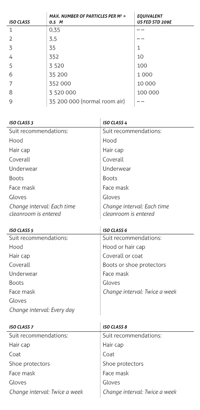 Il s’agit d’un environnement avec un niveau de polluants, tels que poussière, microbes dans l’air, aérosols (gaz à particules) et fumées chimiques, contrôlé. Le niveau de pollution est indiqué comme le nombre de particules de taille supérieure à 0,5 micromètres (abrégé en μm, 1 millionième de mètre) par mètre cube d’air. Un cheveu a