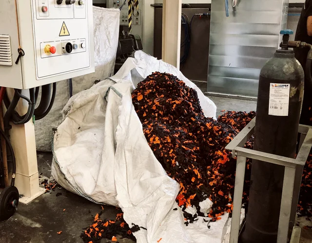 - Daar worden de fournituren verwijderd en de kleding wordt versnipperd.