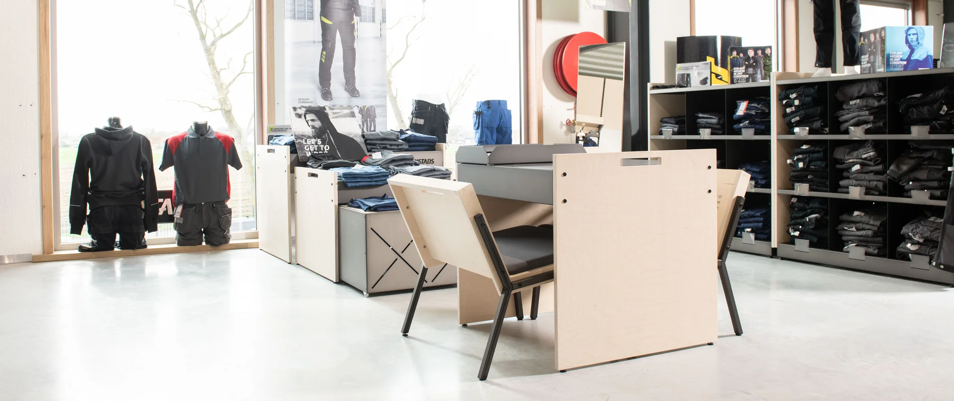 Sinds de overname van Copa Tools in 2012 in Aalter werkt Kristof met Fristads. Hij is erg te spreken over de ontwikkeling van de Fristads-collectie de afgelopen jaren. “De kledinglijn is moderner geworden, heeft een mooie uitstraling en gaat lang mee. Daarom hebben we besloten meer met het merk te willen doen in het nieuwe pand. Hier hebben we de ruimte om de kleding mooi te presenteren.” Voor de inrichting vertrouwde Ruwomat op de samenwerking en ideeën van Fristads. Key Accountmanager Claude Devos: “Het is fijn om met mensen samen te werken die achter het merk staan en willen innoveren. We hebben een ontwerp voor een conceptstore van 55 m2 laten maken. Voor de collectie hebben we gekeken naar wat goed loopt en welke kleding bij anderen succesvol is. De nieuwe conceptstore heeft een goede belichting en is meer dan een showroom voor werkkleding geworden. Het is een inspiratiebron, winkel en belevenis in één.”
