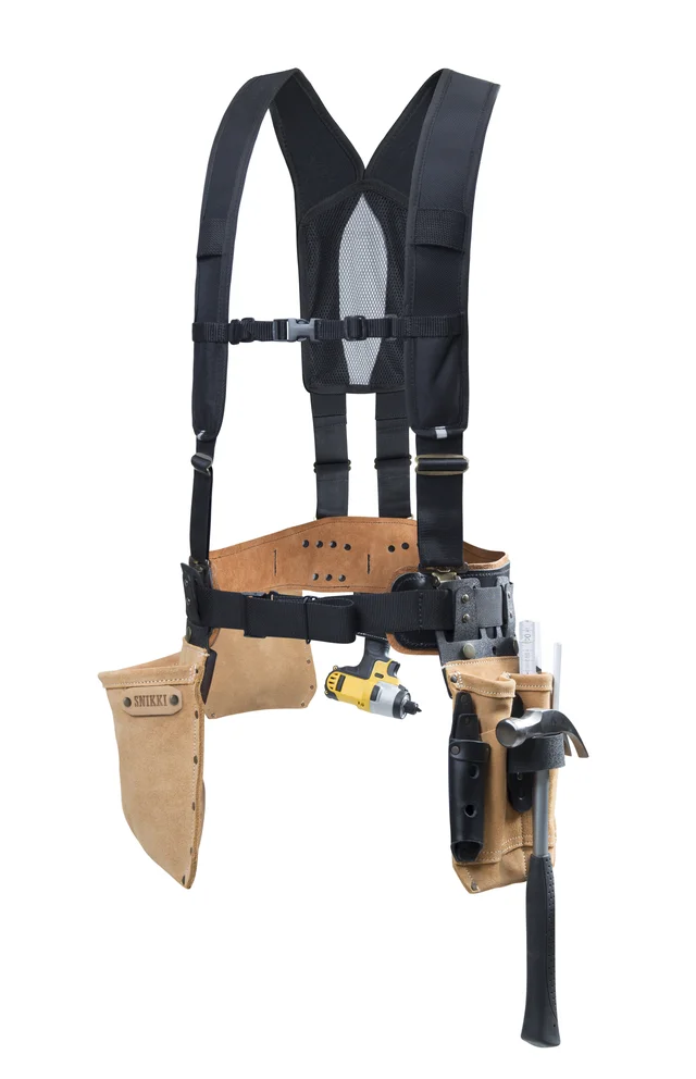 Kies tussen onze ergonomische riemen in leder of lichtgewicht materiaal. Voeg bretels toe voor een verbeterd comfort. Brede schouderpartijen die niet wegglijden ontlasten rug en heupen en verdelen het gewicht van het gereedschap.