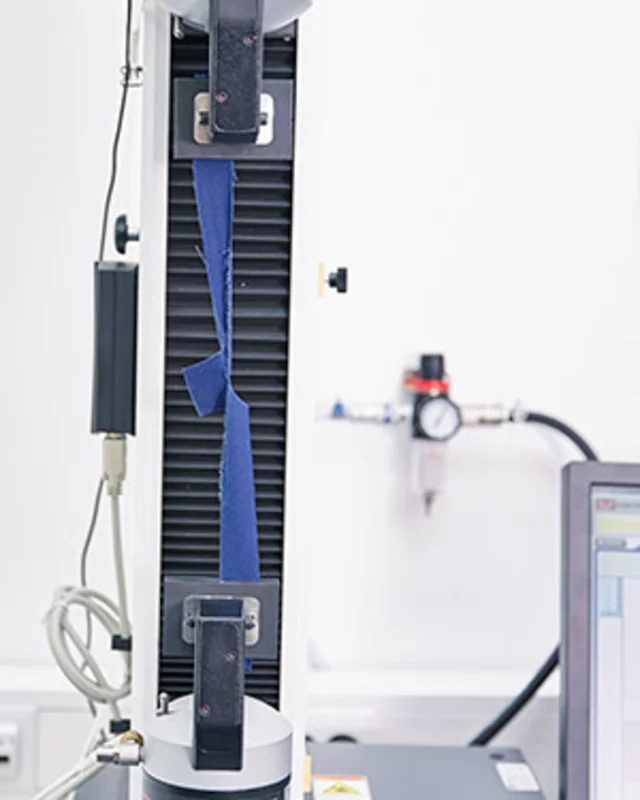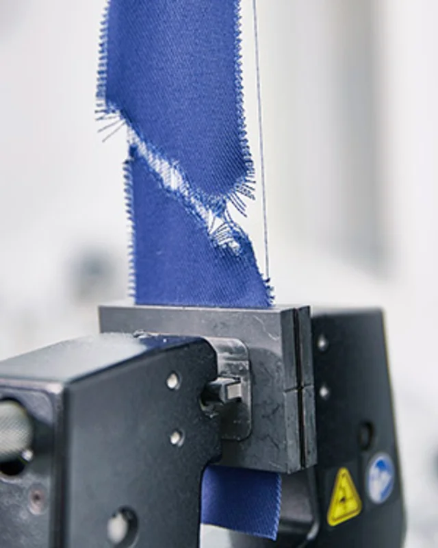 Een stofmonster van vijf centimeter breed wordt bevestigd aan een trekbank en onderworpen aan toenemende belastingen totdat het scheurt. De maximale kracht die tijdens de test wordt gemeten, wordt geregistreerd en weergegeven in Newtons.