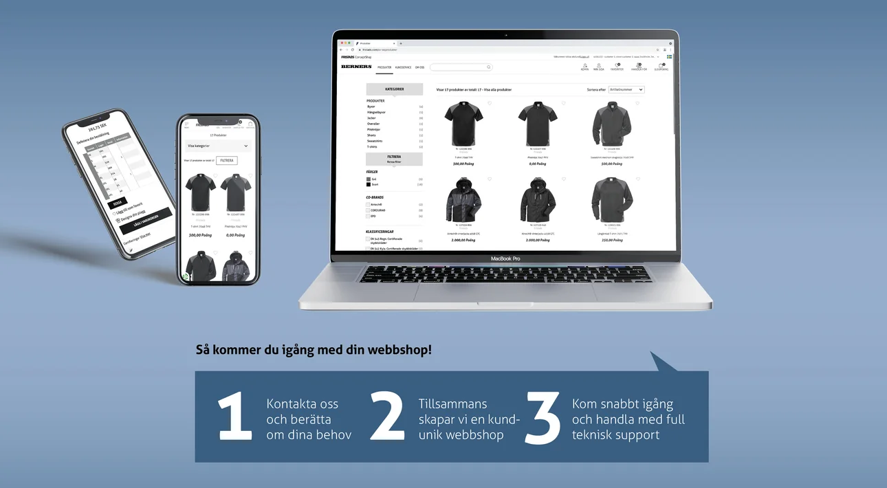 Vi vet att dina kunder har viktigare saker för sig än att handla kläder. Därför har vi skapat Fristads ConceptShop för slutkund – en komplett och användarvänlig e-handelslösning där din kund kan göra affärer med dig och med några knapptryck beställa sina arbetskläder från en av Europas ledande tillverkare. En kundanpassad webbutik som effektiviserar din kunds inköpen av arbetskläder och skyddsutrustning. Här kan din kund se sina priser och beställa profilerade kläder med snabba leveranser. Fristads ConceptShop är så klart öppen 24/7, så beställning kan läggas när det passar kunden!