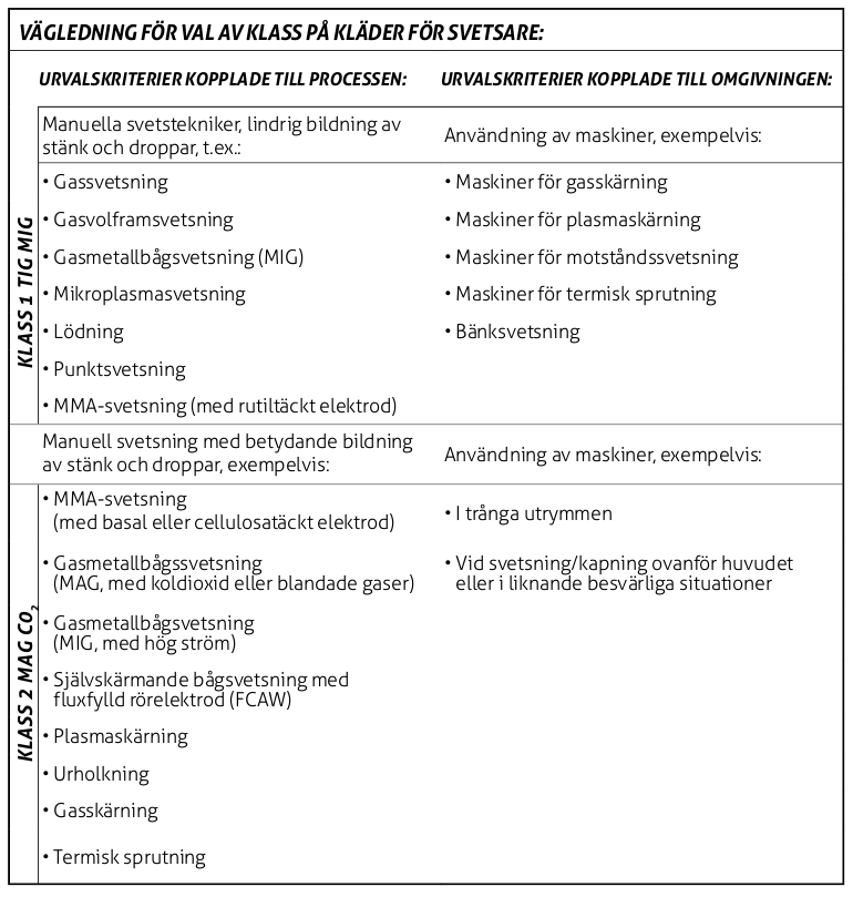 I den här tabellen får du vägledning om vilken svetsklass dina kläder behöver ha.